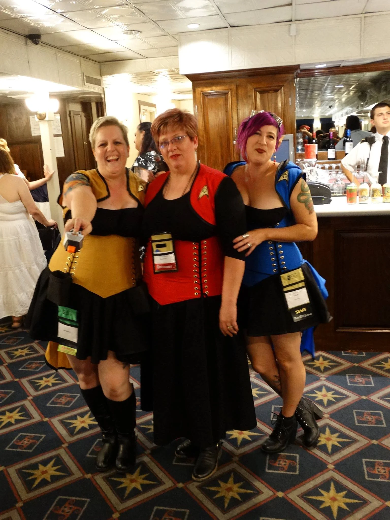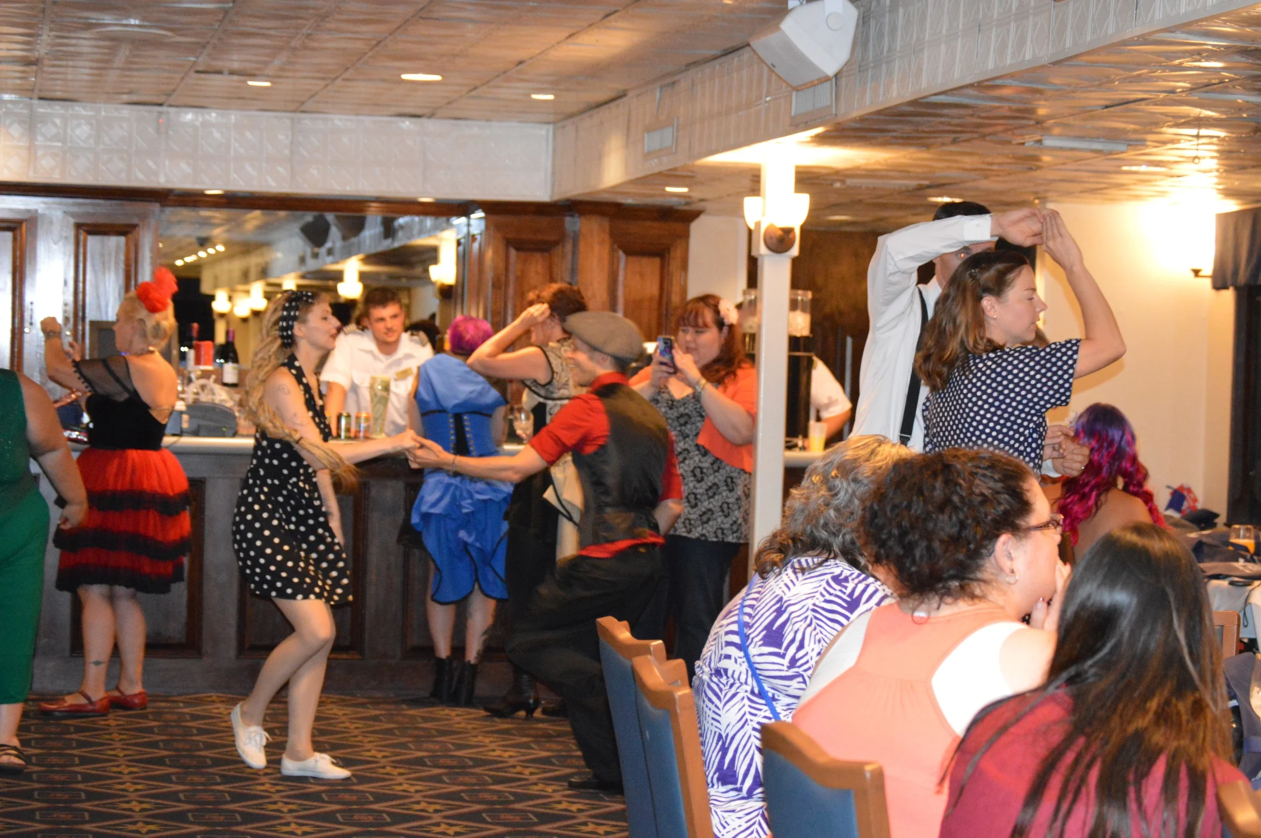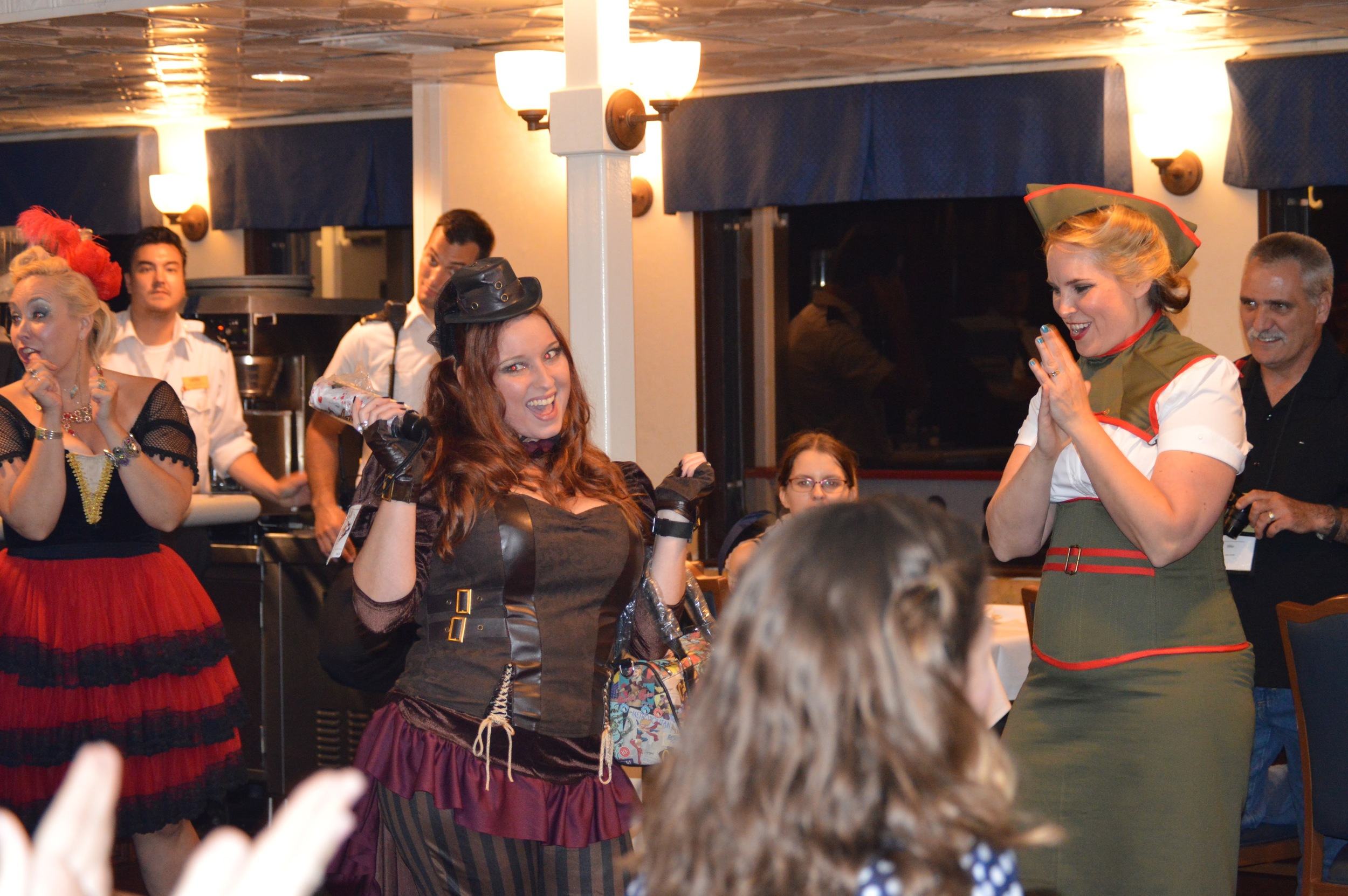 The talented Savannah Swing Cats joined us to keep the Dieselpunk vibe alive during the cruise. Here are some pictures of the fun. They are a combination of pictures from our readers, and professional shots from the talented Ash Art and Design. Our outfits were custom designed by the amazing Lori Ann Costume Designs.